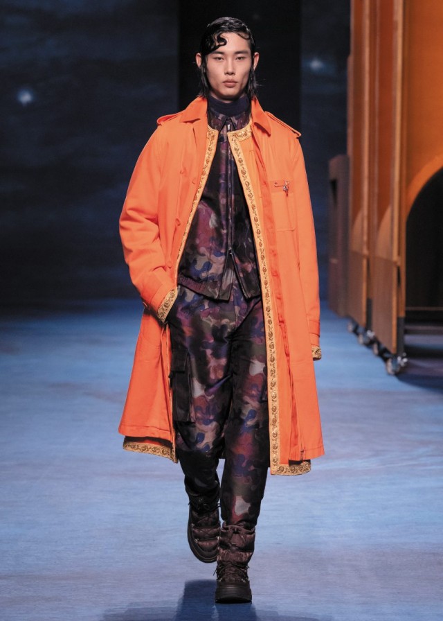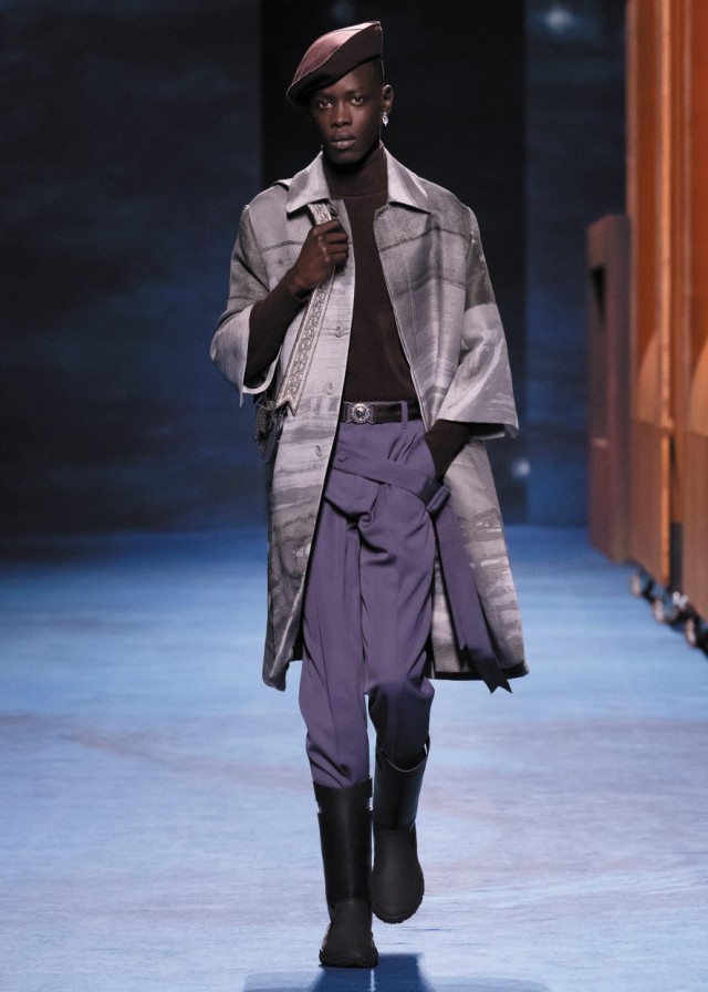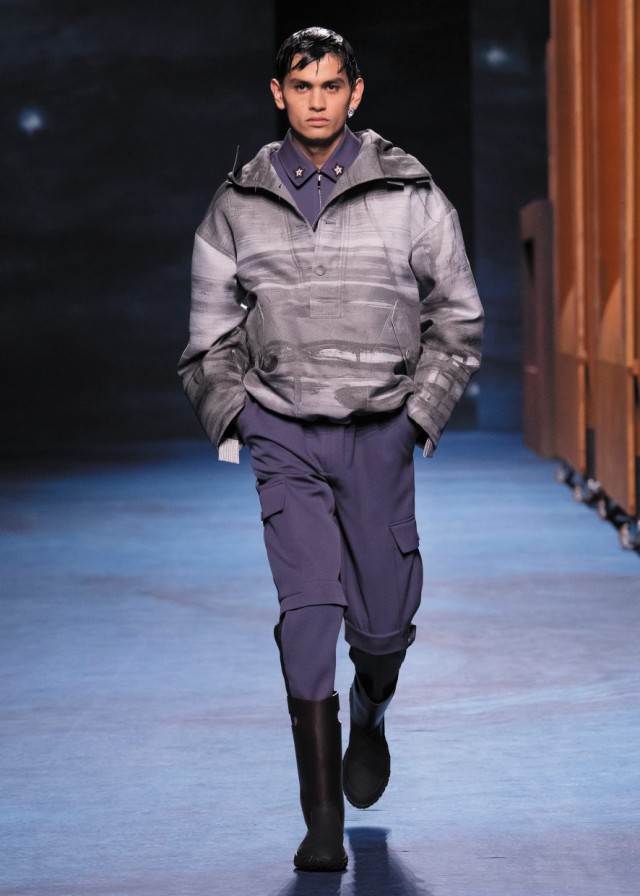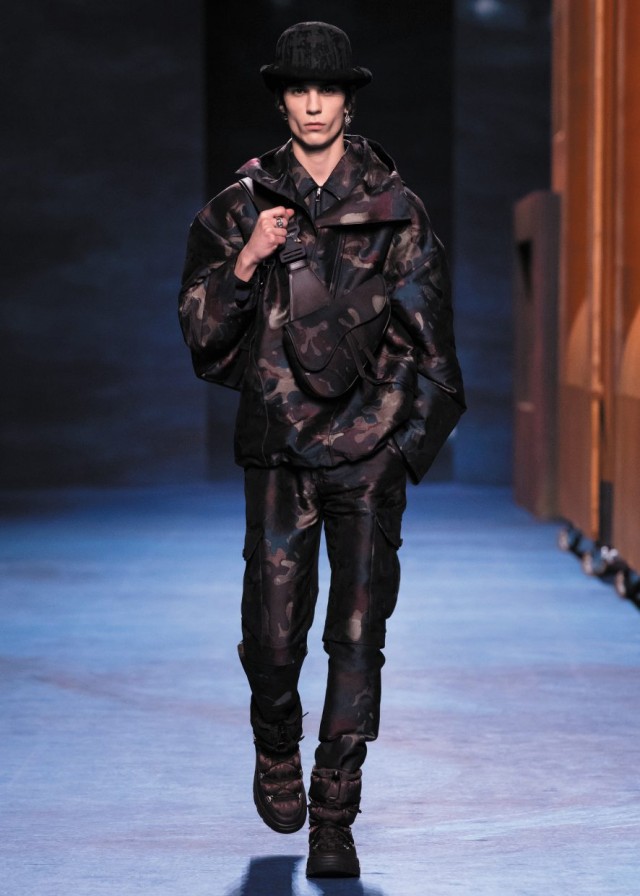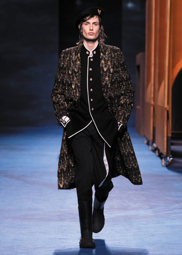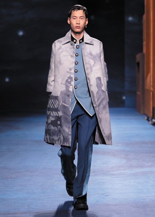 Kim Jones reiterates his formula for the men’s collection of the Maison on avenue Montaigne: a collaboration with an artist – in this case Peter Doig – and the reference to the elements of couture as codified by Monsieur Dior and his successors.